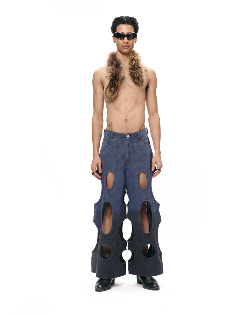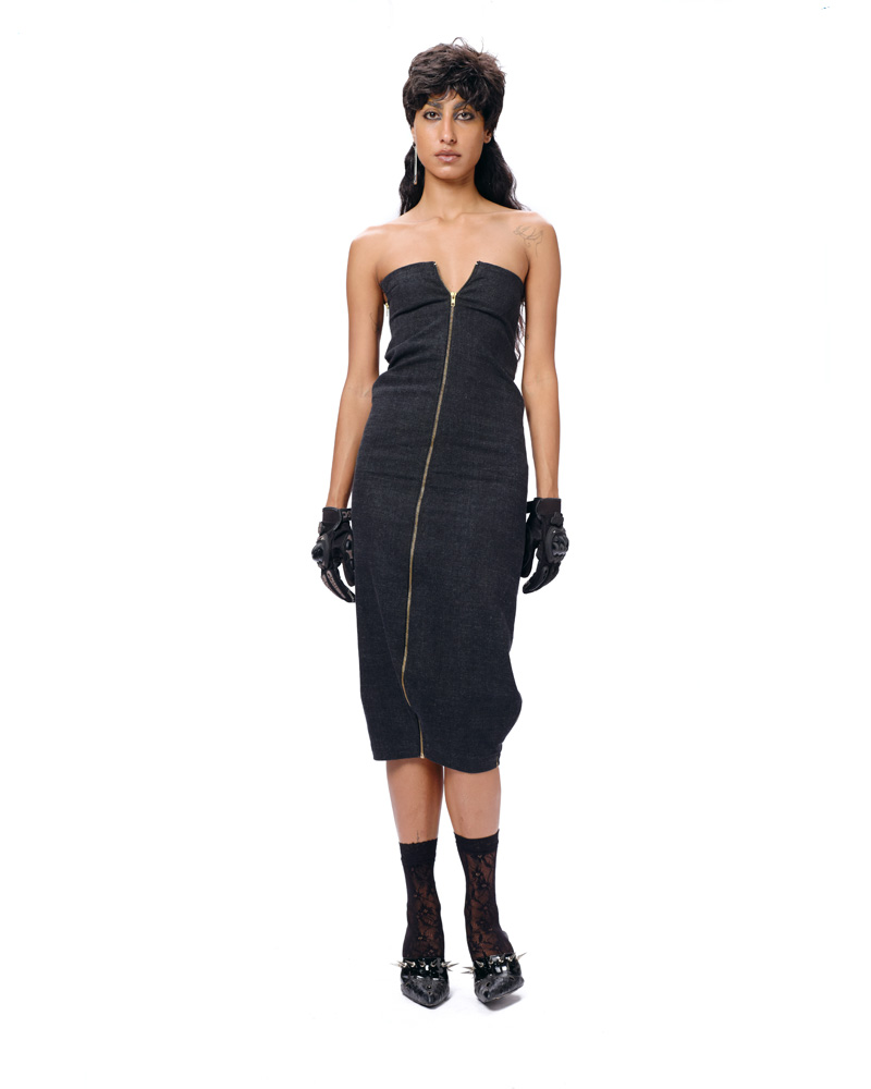 The oversized hardware lock sits heavy on the chest, turning vulnerability into dominance.
